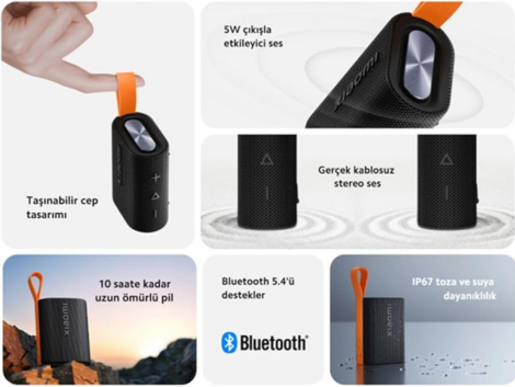 • Exquisitely compact Easier to carry The lightweight design allows for easy portability, making it even more convenient. Experience enchanting melodies anytime, anywhere.resistance Unstoppable in any weather With certified professional protection and enhanced safety features, great music can be by your side during outdoor activities, whether you’re at the beach or by the pool.Fashionable and more personalised The simplistic design allows for both horizontal and vertical placement, making it adaptable to any setting. The sophisticated black tone is complimented by a splash of vibrant orange to create a bold and distinctive colour combination that exudes personality.Bring back exceptional sound quality Featuring a large mesh area design, the speaker delivers more transparent sound and balanced audio. With a built-in subwoofer, it delivers deep and rich bass tones.Expertly tuned for masterful sound qualityUninterrupted auditory pleasure Enjoy up to 10 hours of non-stop playback with a fully charged 1000mAh batter